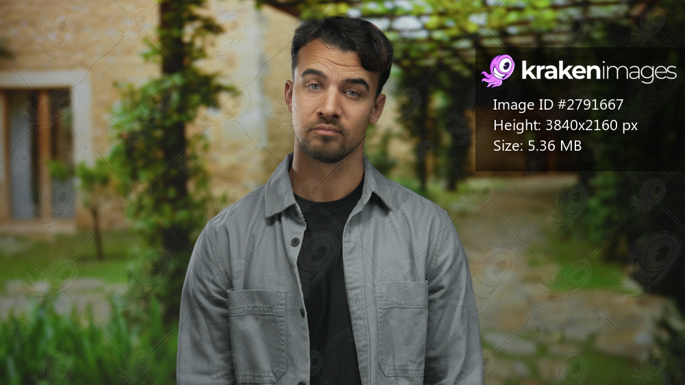 Young hispanic man outdoors clapping in a serene garden setting, featuring rustic stone path and lush greenery bathed in natural light, creating a tranquil atmosphere. - Kraken Images