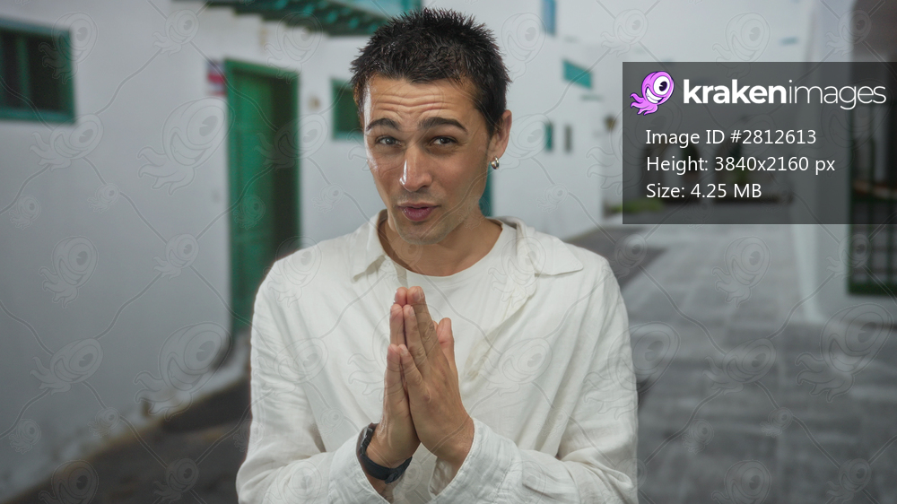 Young hispanic man outdoors with clasped hands in a white shirt against a background of white buildings and green doors exuding a relaxed and joyful atmosphere. - Kraken Images