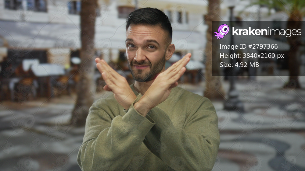 Young hispanic man outdoors gestures no with his finger and crosses arms rejecting in urban street setting with blurred city background and casual attire - Kraken Images