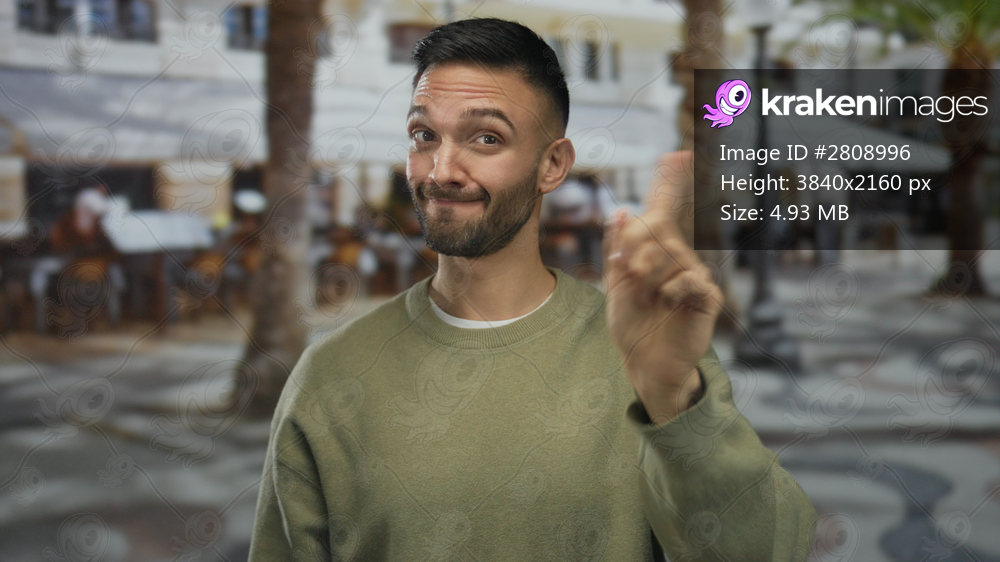 Young hispanic man outdoors gestures no with his finger and crosses arms rejecting in urban street setting with blurred city background and casual attire - Kraken Images