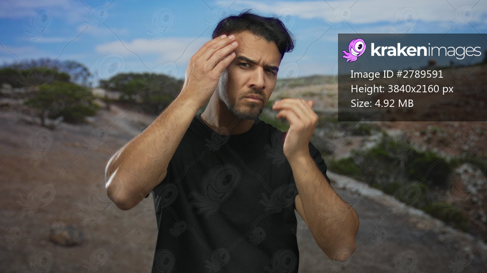 Young hispanic man outdoors in arid landscape touching his face with mountains and clear blue sky in the background showing contemplation and focus