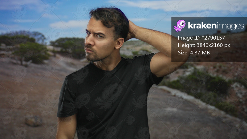 Young hispanic man outdoors in arid landscape touching his face with mountains and clear blue sky in the background showing contemplation and focus