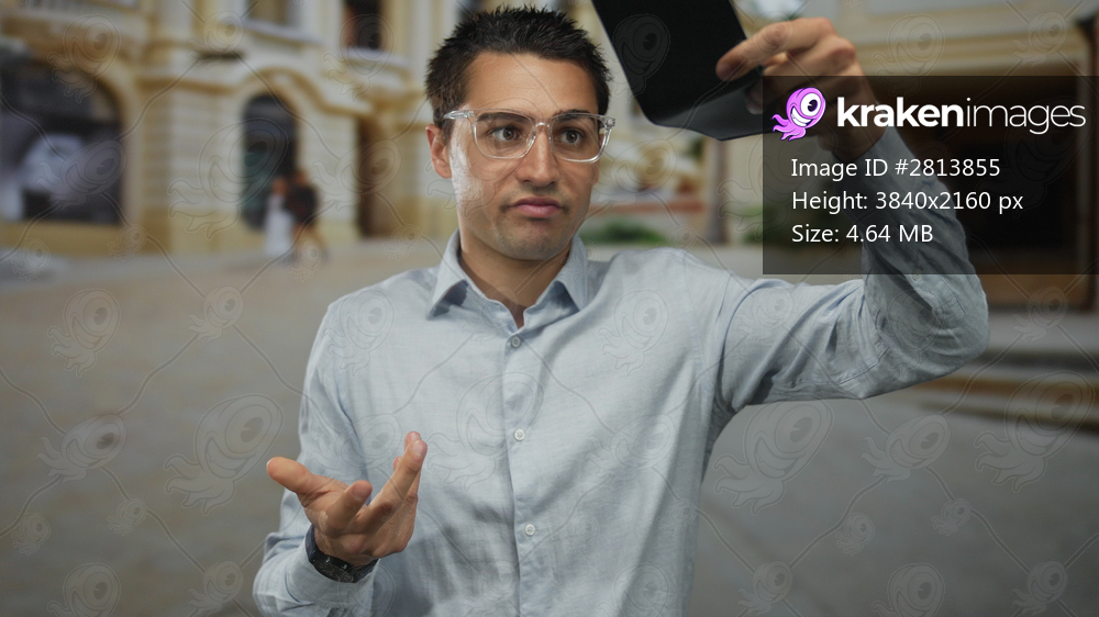 Young hispanic man outdoors in old town checking empty wallet with puzzled expression during daytime