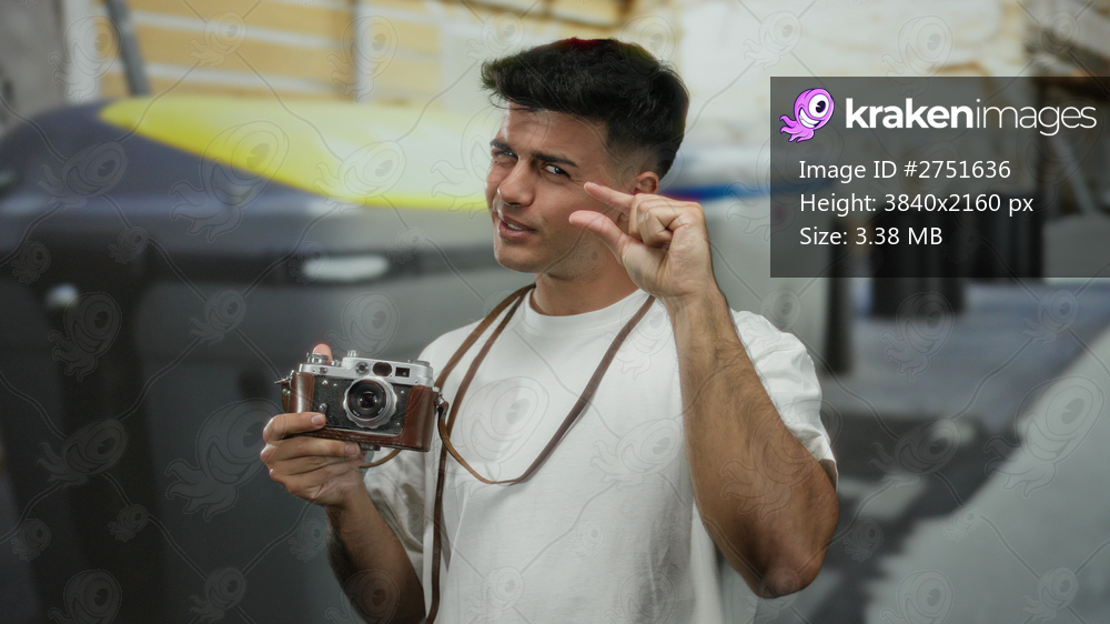 Young hispanic man outdoors on city street playfully gestures with his fingers while holding a vintage camera, capturing the vibrant urban scene.