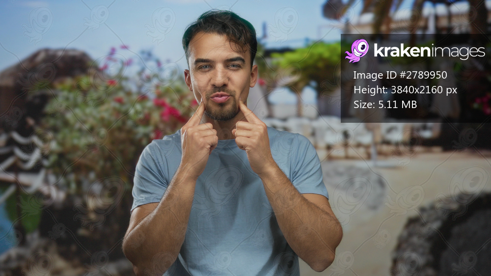 Young hispanic man outdoors puffs cheeks playfully touching them with fingers in a sunny garden setting.