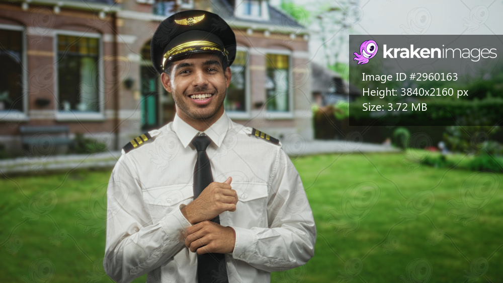 Young hispanic man pilot in uniform adjusts black tie with hands while smiling in front of brick building and lawn; confidence duty.