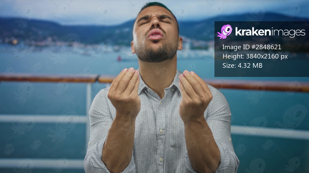 Young hispanic man with pinched fingers gesture and raised hands on street outdoors; uncertainty.