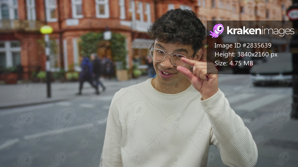 Young hispanic man pinches fingers on busy city street in daylight with blurry passersby beyond; precision.