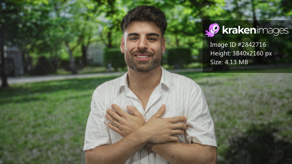 Young hispanic man places hand on chest in forest among green trees under sunlight; gratitude sincerity inner peace.