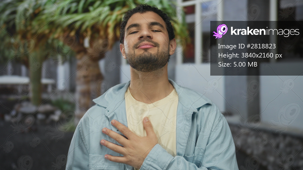 Young hispanic man places hand on chest while standing on a city street by building facade; sincere pride.