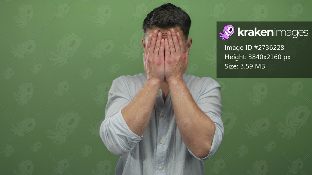 Young hispanic man playfully covers and uncovers his eyes while smiling against an isolated green background wall in these dynamic frames emphasizing emotion and interaction. - Kraken Images
