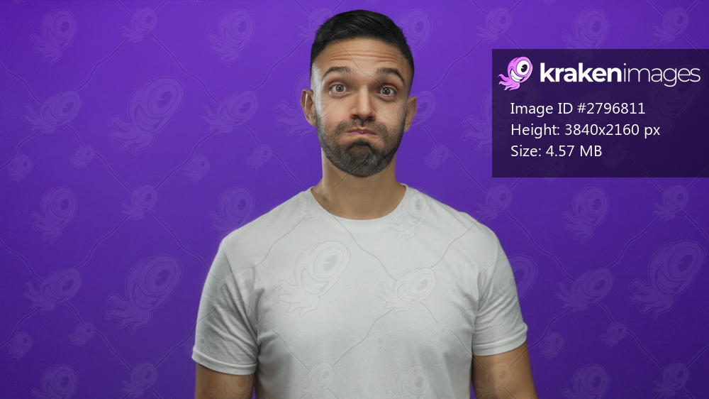 Young hispanic man playfully gesturing with a puffed face against a vibrant purple background wearing a plain white shirt displaying cheerful expressions. - Kraken Images