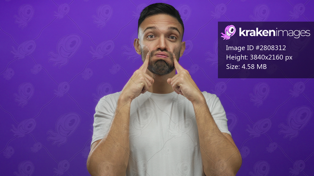 Young hispanic man playfully gesturing with a puffed face against a vibrant purple background wearing a plain white shirt displaying cheerful expressions. - Kraken Images