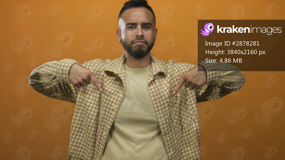 Young hispanic man pointing both fingers at his shirt pocket while wearing a checked overshirt in an orange studio wall; confidence.