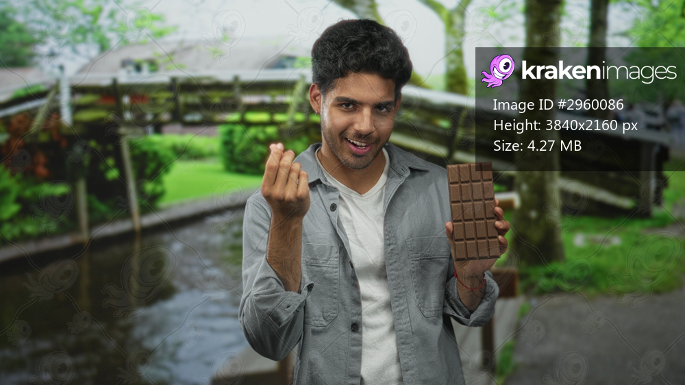 Young hispanic man pointing finger at a large chocolate bar while holding it beside a wooden footbridge over a canal on street; playful craving.