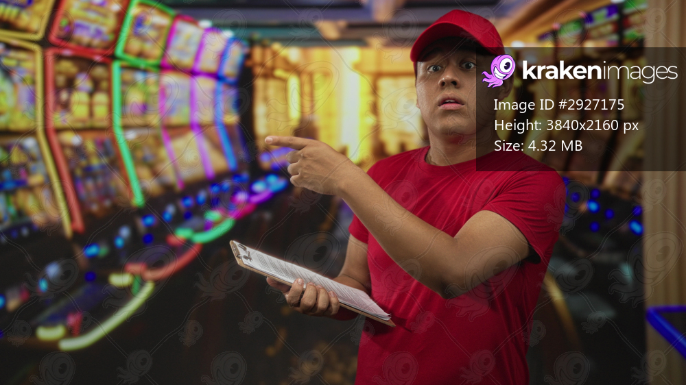 Young hispanic man pointing finger at slot machine and holding clipboard in casino building; surprise inspection.
