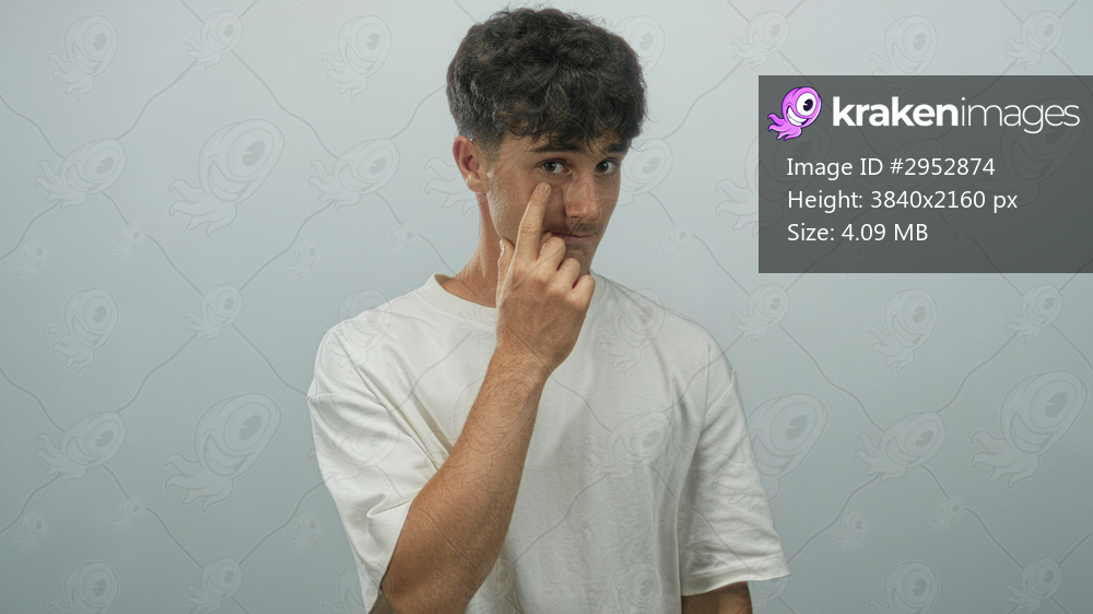 Young hispanic man pointing finger to cheek near eye wearing white t shirt in studio with pale blue wall; curiosity youth.