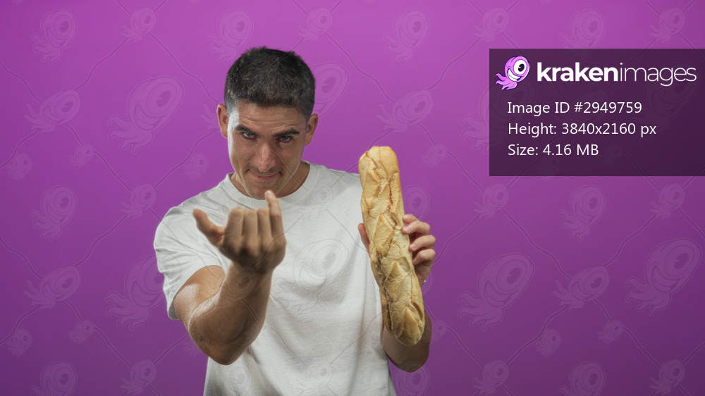 Young hispanic man pointing finger while holding a long baguette in a purple studio with direct gaze and white t shirt; playful invitation.