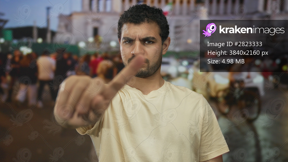 Young hispanic man pointing index finger directly at camera in a crowded urban street at dusk; serious.