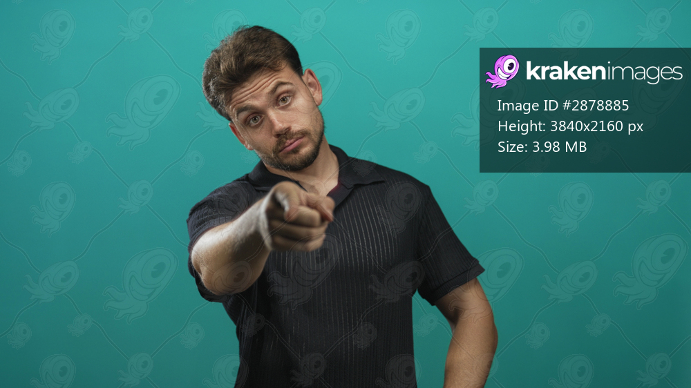Young hispanic man pointing index finger toward camera in teal studio, visible forearm and raised hand; warning.