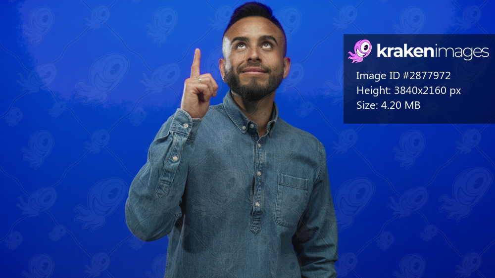 Young hispanic man pointing index finger up while smiling and looking upward in studio against a vivid blue wall wearing a denim shirt and rings; idea optimism. - Kraken Images