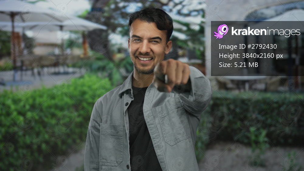 Young hispanic man pointing and smiling in outdoor garden setting surrounded by lush greenery and sunny atmosphere.