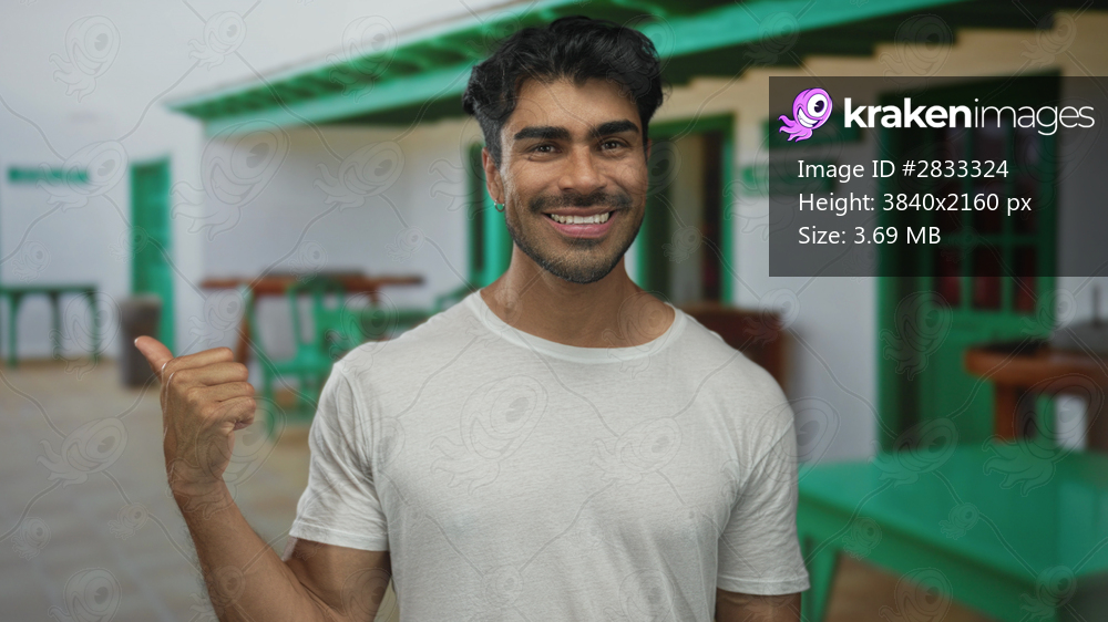 Young hispanic man pointing thumb behind him at a white house entrance on a sunny day; warm welcome.