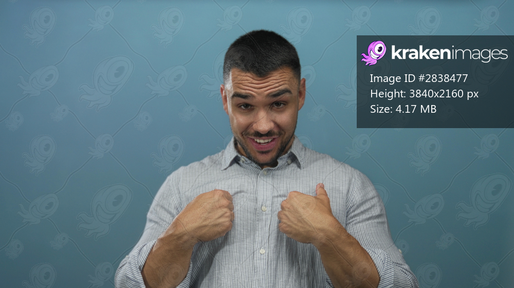 Young hispanic man pointing thumbs to chest and clenching fists in a studio with bright blue backdrop; enthusiasm.