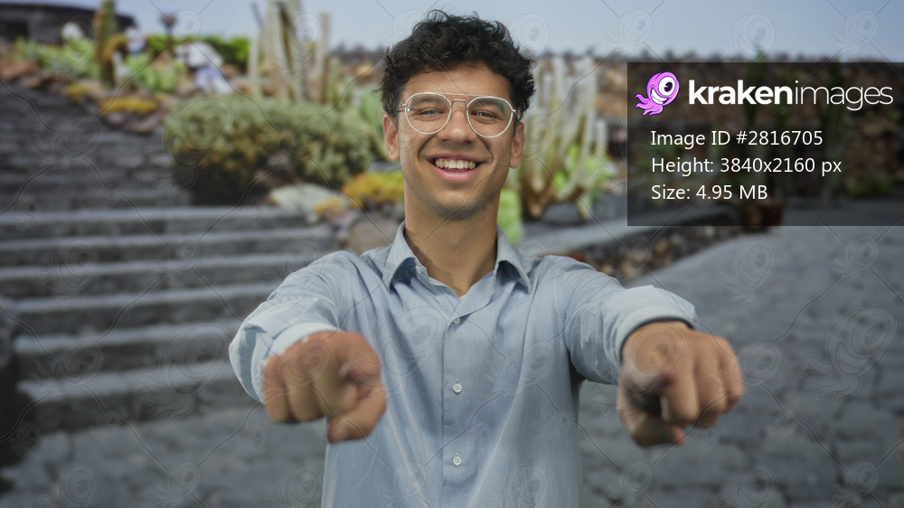 Young hispanic man points both fingers to camera among green park shrubs and stone steps; connection.