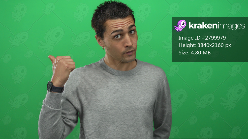 Young hispanic man points finger at camera in studio before green wall with stern expression; rejection.