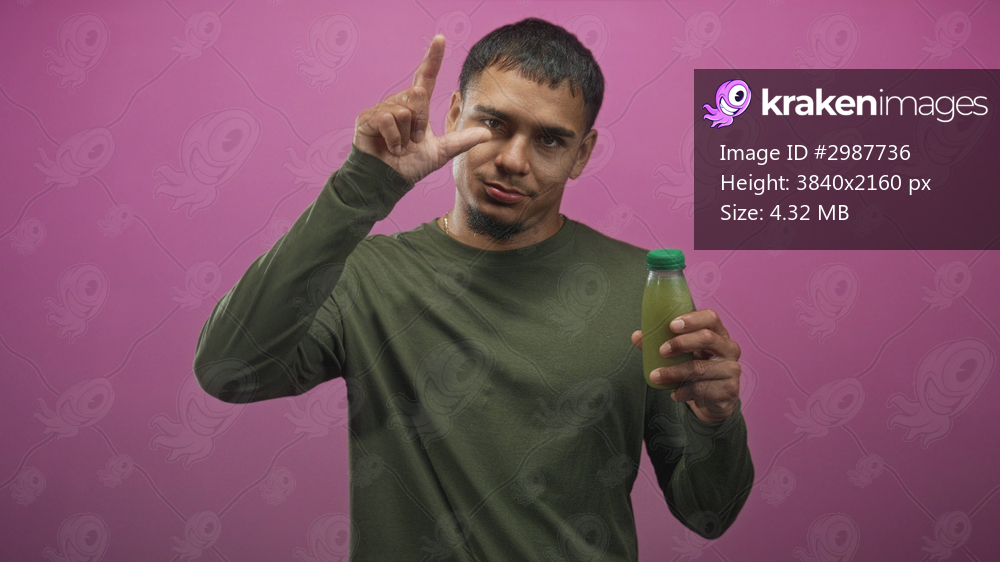 Young hispanic man points finger at camera while holding a green juice bottle against a pink studio backdrop; confidence promotion.