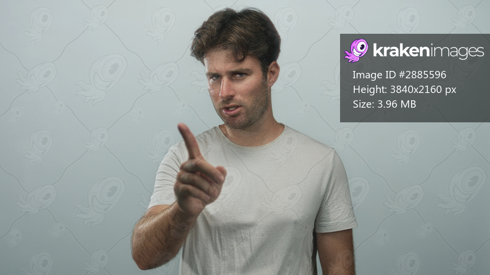 Young hispanic man points finger forward in studio against pale blue wall wearing light gray tshirt; warning caution.