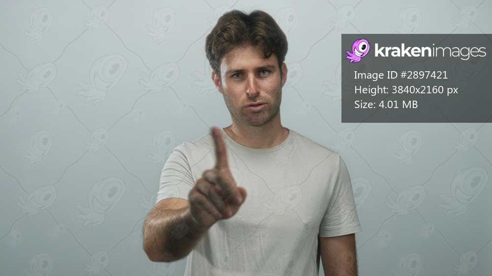 Young hispanic man points finger forward in studio against pale blue wall wearing light gray tshirt; warning caution.