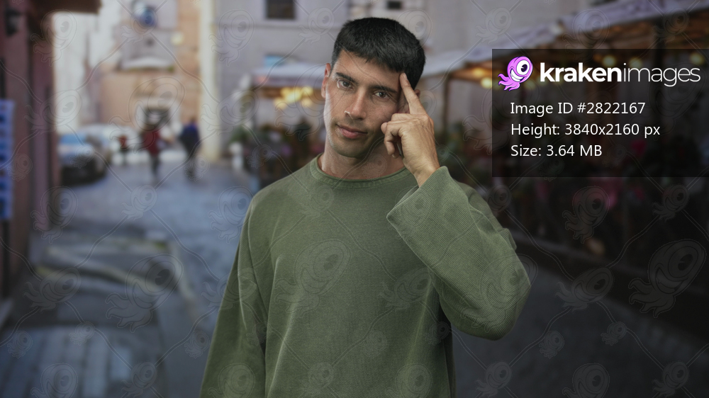 Young hispanic man points finger to camera while standing on street with outdoor restaurant terrace visible; invitation connection.