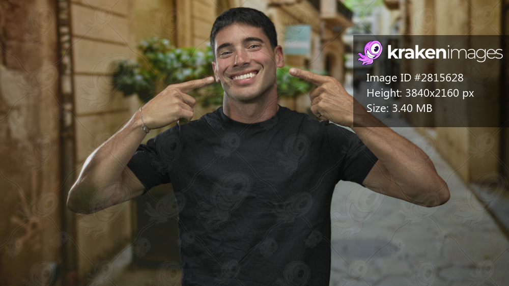 Young hispanic man points finger to cheeks while showing broad smile in narrow sunlit street; confidence.