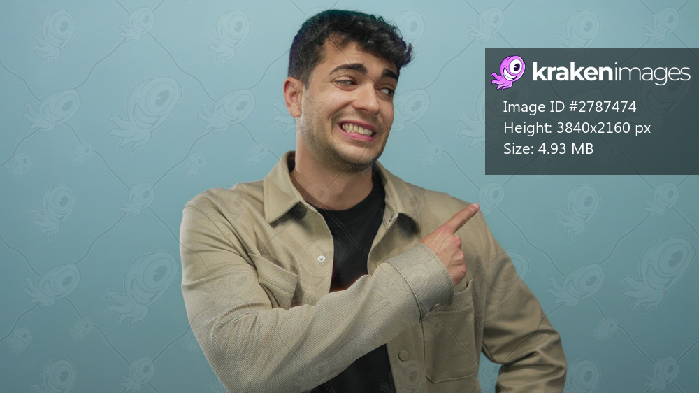 Young hispanic man points finger to side in studio; indecision choice.
