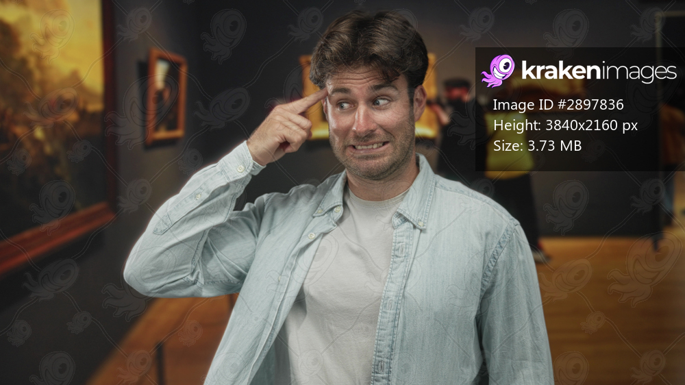 Young hispanic man points finger to temple while half smiling in gallery building; confusion curiosity.
