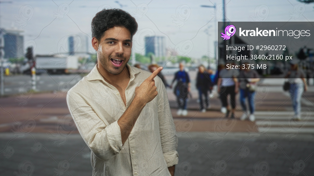 Young hispanic man points finger to the right at a busy crosswalk on street, bare forearm and hand visible in beige linen shirt; friendly invitation.
