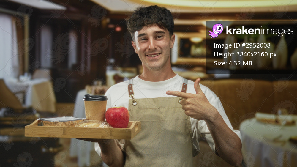 Young hispanic man points finger to wooden tray holding coffee cup, wrapped bread and red apple in restaurant building; friendly service.