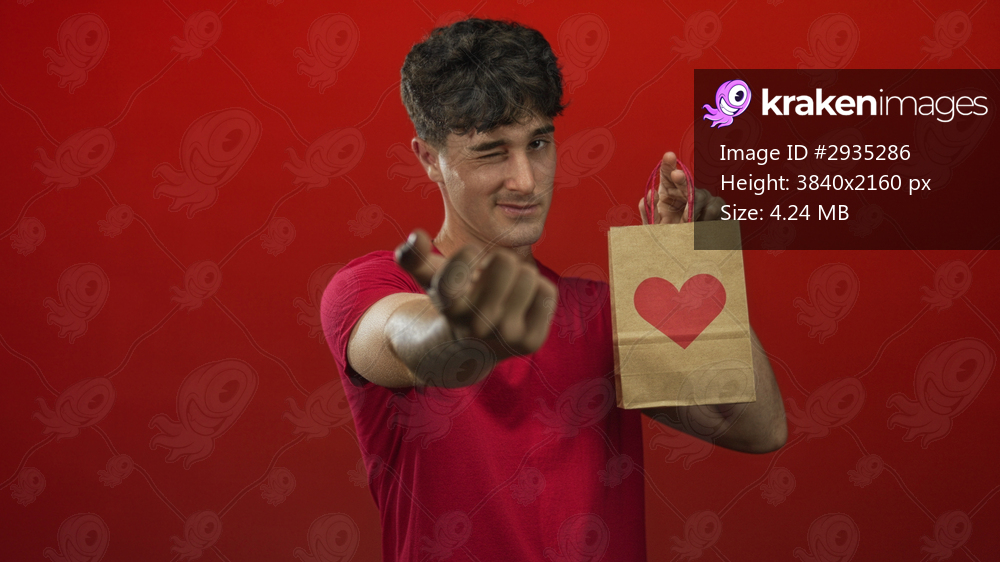 Young hispanic man points finger toward camera while holding a paper bag with a heart in red studio; love invitation.