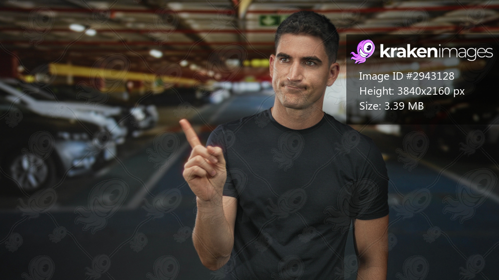 Young hispanic man points finger up in parking building beside parked cars, showing bare hand and forearm; warning reminder.