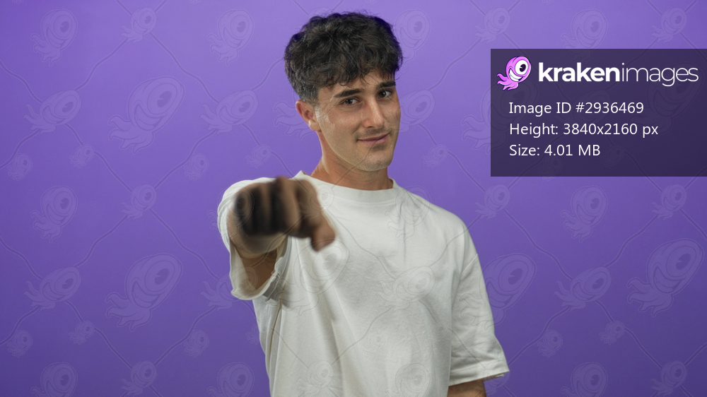 Young hispanic man points fist to camera in purple studio wearing white tshirt with relaxed smile and extended arm; confidence.
