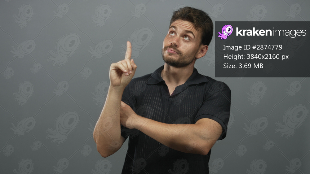 Young hispanic man points index finger upward in gray studio wearing black polo shirt with one arm folded across chest; thoughtful reflection.