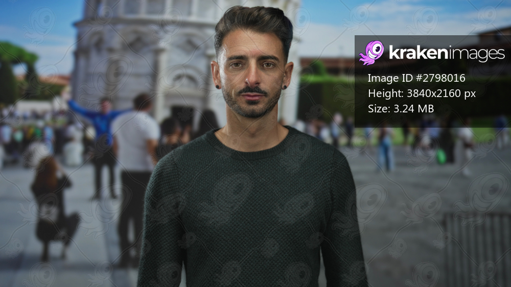 Young hispanic man poses in front of the historic leaning tower of pisa building outdoors; travel joy.