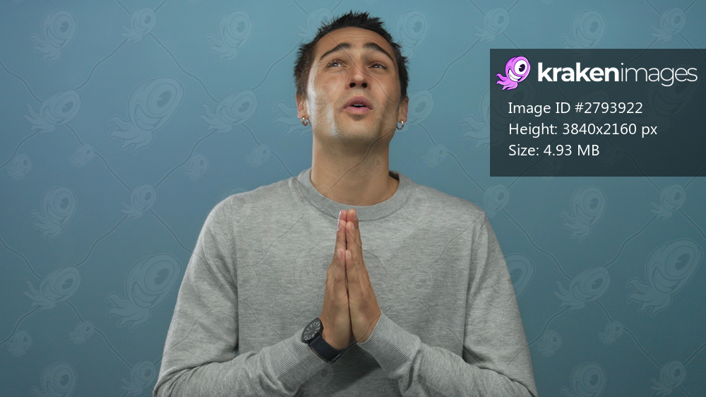 Young hispanic man praying with closed eyes over isolated blue background, expressing hope and spirituality.