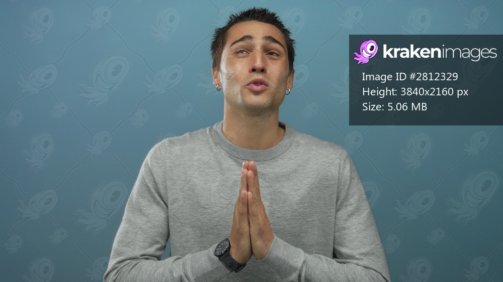 Young hispanic man praying with closed eyes over isolated blue background, expressing hope and spirituality.