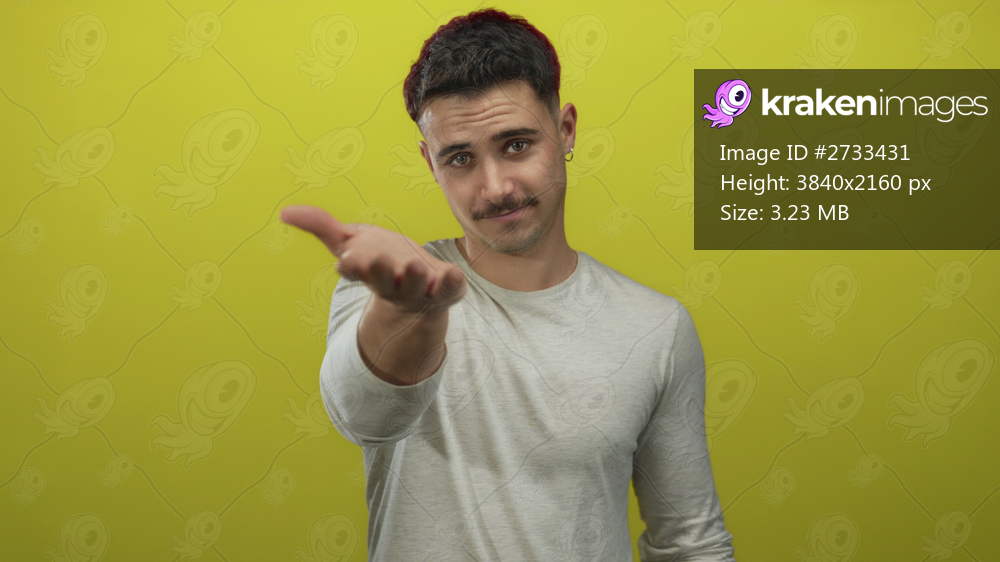 Young hispanic man presenting hand against vivid yellow background, conveying openness and invitation with a friendly expression.