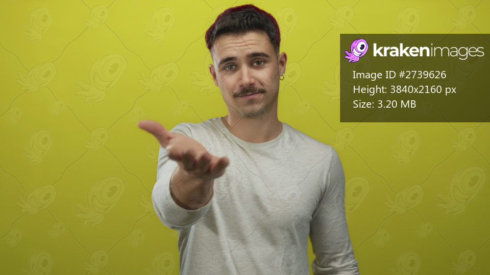 Young hispanic man presenting hand against vivid yellow background, conveying openness and invitation with a friendly expression.