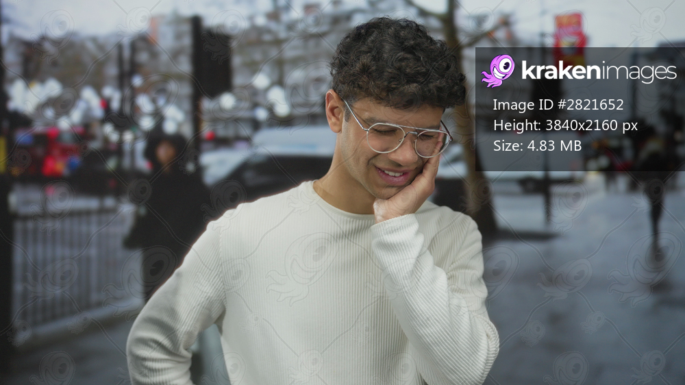 Young hispanic man presses cheek with his hand for toothache on a rainy city street near blurred traffic lights; discomfort.