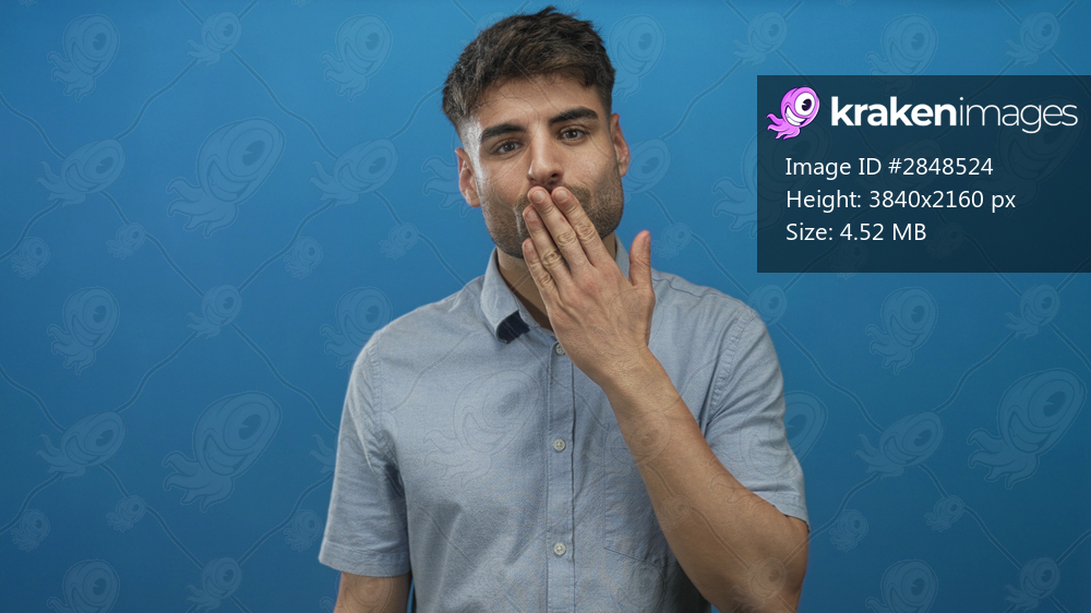 Young hispanic man presses hand to lips for a kiss gesture toward camera in a bright blue studio setting; affection invitation.